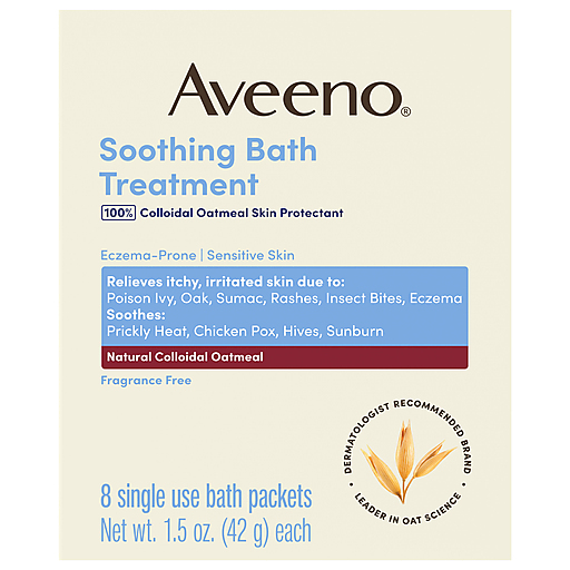 Aveeno Fragrance-Free Soothing Bath Treatment with 100% Natural Colloidal Oatmeal helps relieve itchy, irritated skin due to poison ivy, poison oak, poison sumac, rashes, insect bites & eczema. Recommended by professionals, this soothing bath soak provides relief of itchy, irritated & dry skin while soothing prickly heat (heat rash), chicken pox, hives & sunburn. Formulated with 100% natural colloidal oatmeal, a long recognized ingredient that relieves itching naturally, the soothing bath treatment disperses in bathwater to treat dry, irritated skin while cleansing & moisturizing, for soft, smooth, healthy-looking skin. This soothing bath soak is suitable for eczema and sensitive skin has been allergy tested & is free of fragrance, paraben, dyes & soap. From the dermatologist-recommended brand for over 70 years, use the individually wrapped bath packets along with Aveeno Skin Relief Body Wash & Moisturizing Lotion to soothe your entire body.