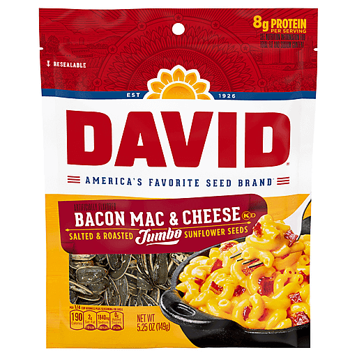 Ditch the chips and grab a bag of DAVID Bacon Mac & Cheese Jumbo Sunflower Seeds, a deliciously-salty, and crunchy, keto friendly snack with American classic comfort food flavor. Grab a DAVID Seeds snack for a delicious, and crunchy bite on the go. Each 5.25 oz bag contains about 2 servings, with 180 calories. Since 1926, DAVID Seeds provides a quality difference that you can taste with select top-quality seeds, roasted and seasoned to perfection.