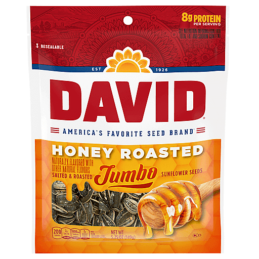 Crack into a delicious snack from America's favorite seed brand with DAVID Honey Roasted Sunflower Seeds. These tasty snack seeds are whole roasted to perfection and seasoned with quality ingredients for an authentic homestyle flavor. Each jumbo size sunflower seed is deliciously sweet and savory with honey roasted flavor and the perfect amount of salt. Whether you need a work snack to enjoy in the office, a baseball snack to enjoy at the big game or a convenient travel snack for on-the-go, these flavored sunflower seeds have you covered. With 8 grams of protein per serving and no artificial flavors or colors, you can feel good about your snacking. Savor simplicity with DAVID sunflower seeds, because the best things in life are often the simplest.