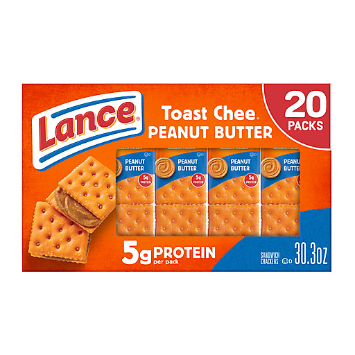 crackers, paired with our irresistible real creamy peanut butter filling. These are a truly iconic sandwich cracker snack! At Lance, sandwiches mean more: they aren’t just two somethings with whatever in the middle. ToastChee Peanut Butter crackers are our fresh-baked crackers on the outside paired with real peanut butter filling to create a much-loved and tasty snack.Or, as we say, a Lance Sandwich cracker is two awesomes on the outside with totally incredible in the middle. You get 20 cracker snack packs with 6 sandwich crackers per pack. That means you can enjoy these convenient peanut butter and cracker creations during lunch breaks, for afternoon snacks, or snacking any other time - even on the go. The next time you’re ready to take a moment or need a quick pick-me-up, make it your one and only Lance Sandwich crackers, the king of all sandwich crackers. Bring it!