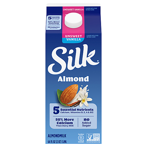 Enhance your morning routine with Silk Unsweet Vanilla Almondmilk.*** A smooth, creamy, unsweetened almond milk made for mornings, this non dairy milk delivers delicious nutrition with no added sugar** and 5 essential nutrients, including calcium and vitamin A, D, E and B12. Vitamin A helps support the immune system, vitamin B12 helps the body turn food into energy, and antioxidant vitamin E promotes cell health. Plus, this plant based milk contains 50% more calcium than dairy milk* and provides vitamin D to help support strong bones. Silk Almondmilk is free of dairy, soy, lactose, gluten, casein, egg and carrageenan. Whether you’re making a bowl of breakfast cereal, adding it to your morning smoothies, drinking straight out of a glass or enjoying a frothy coffee drink, Silk Unsweet Vanilla Almondmilk delivers delicious almond taste for happy, healthy families. Start your day with Silk, America’s #1 Plant Based Milk Brand,**** for an unsweetened vanilla almond milk that will leave you feeling planty good. *Silk Almondmilk: 470mg of calcium per cup versus 309mg calcium per cup of reduced fat dairy milk. USDA FoodData Central, 2022. **Not a low calorie food. ***Flavored with other natural flavors. ****Source: Circana MULO+, Last 52 Weeks Ending 3.30.25, Dollar Sales and Volume.